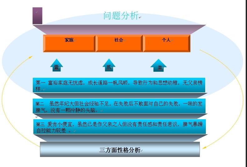 老三(化名) 男 25歲初中文化 ,已婚(父親)入校原因:自愿后經(jīng)發(fā)現(xiàn)李老三同學(xué)本身年齡很大,但心里年齡較小所做事情幼稚,愛貪小便宜,脾氣較差,自控能力較差,在家打老婆,更缺乏一個做父親的責(zé)任。