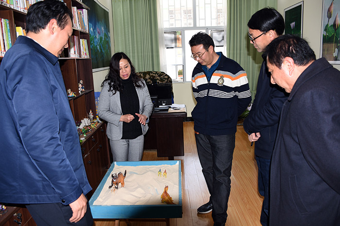 毛局長一行在的陪同下,依次參觀了學校辦公樓、監控安防設備、食堂餐廳、學生宿舍、心理輔導室等,還特地查閱了學校心理輔導工作記錄情況,并與心理輔導老師們進行了工作交流;隨后,在多媒體教室觀看了教學活動短片。