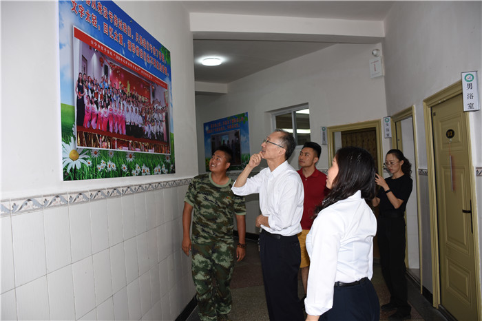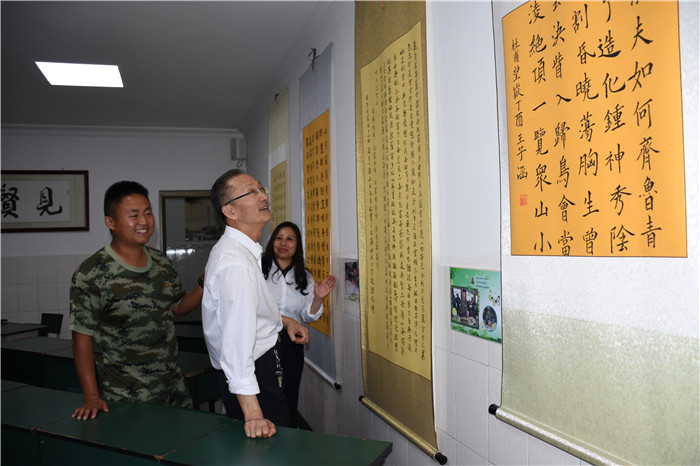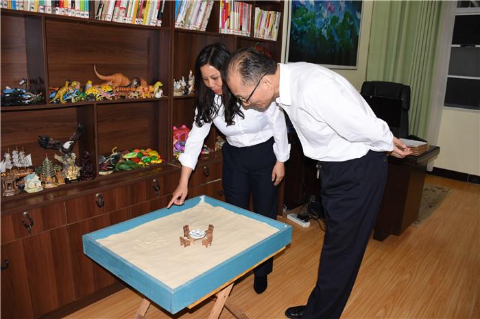 當得知每個孩子入校都要從洗碗、洗衣服、疊被子的生活小事開始做起時,翟教授連連夸贊學校的養成教育設置得非常好;當看到學生宿舍的被子疊得整整齊齊,小教室里孩子們有模有樣的書法時,翟教授更是感受到了孩子們蛻變的態度、心境與決心;當走到心理輔導室時,翟教授饒有興趣地查閱了學校心理輔導工作記錄情況,并與我校心理輔導首席專家周榕樺老師進行了深入的探討交流。翻看著每個孩子的成長記錄清晰詳細,量表簡潔適用,翟教授連連稱贊我校心理輔導工作開展得扎實有效;當看到文化走廊間懸掛的春節圖片時,翟教授連連感嘆學校老師24小時傾情陪伴孩子的無私奉獻;當得知學校辦學八年來,成功改變了數千名孩子,更是給予了高度評價。