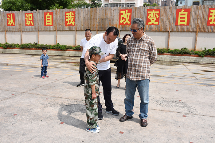 當看著接待室那面印著老撾文的錦旗,王總既感親切,又非常驚嘆學校的影響力。原來王總的企業有很大一部分業務輻射到老撾國。長此以往,老撾成了他的第二個故鄉。在安寧這個美麗、祥和的全國文明城市,他也從未想過學校的生源除了省內、國內各地,竟也延伸到了國外;當看到學校墻面醒目地掛著“每個孩子都是天才,不能用爬樹的能力來判斷一條魚的才干”的辦學理念時,王總更是對學校獨樹一幟的辦學特色連連稱贊;當走進宿舍樓,看著特別的校園文化,孩子們宿舍里溫馨的大床、整齊的被子,他更是對學校暖心全面的德育教育和孩子們良好的生活習慣稱贊不已;當看著操場上最小的“小兵”精神抖擻地站著軍姿,王總情不自禁地走近和他親切交流,孩子也甜甜地叫著“爺爺好”,他的乖巧可愛,讓王總特別欣慰,并與他開心擊掌,鼓勵他好好學習;當得知學校辦學八年多來,成功改變了數千名孩子時,更是給予了學校高度評價。