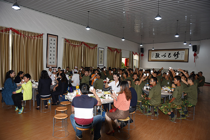 全體師生向孔子像行完鞠躬禮后,進入食堂,準備享用美味。副校長毛積敏擔任了本次活動的主持人,首先給孩子們介紹了中秋節的來歷及習俗,隨后魯校長作了中秋致辭,并陪著大家一起共進晚餐,師生們紛紛舉杯相互表達節日祝福。為感謝幾年如一日、無怨無悔扎根于學校的老師們,魯校長精心準備,給全體教職工發放了精美禮品進行慰問。席間,孩子們迫不及待、自告奮勇上臺自我介紹或表演節目,把晚餐的氣氛推向了高潮。