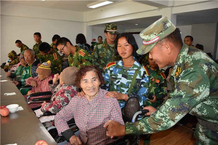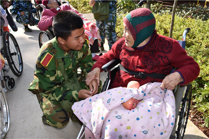 到了敬老院同學們立馬給老人們送上了蘋果,還主動到老人身邊扶著老人散步、推著輪椅陪老人看風景、陪老人們聊天、給老人們按摩,一張張稚嫩的笑臉和一雙雙慈祥的目光碰撞出“家”一樣的和諧、溫馨。聽說老人們喜歡看表演,孩子們就為老人們唱起了軍歌、表演了軍體拳、跳手語舞、演奏葫蘆絲等。豐富的節目博得了老人們的好評,掌聲不斷響起,幾位老奶奶也開心地送上了自己的拿手表演,整個院兒里充滿了掌聲和歡笑聲。