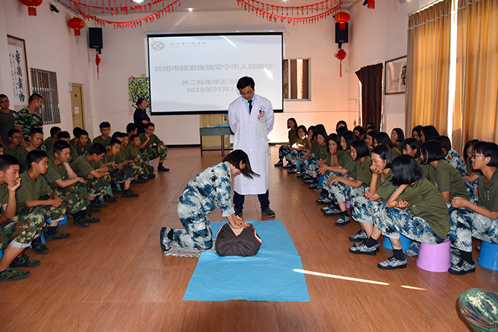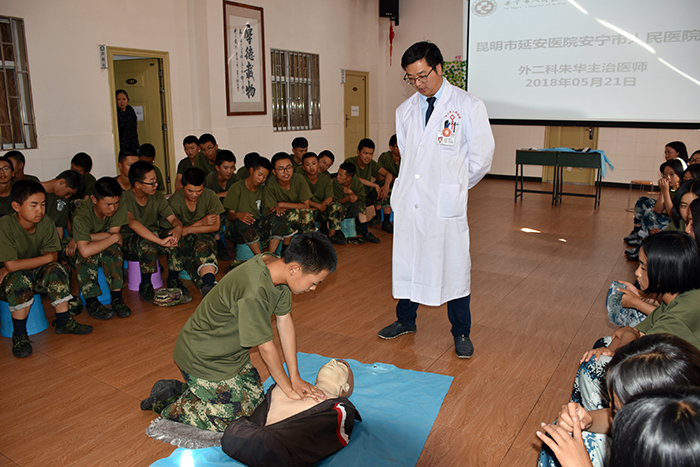 2018年5月21日下午,為全面提高全校學生對突發事故的科學、緊急救護能力,我校特邀請昆明市延安醫院安寧市人民醫院外二科主治醫師朱華、陸峻,護士胡亞瓊等專業醫護人員到校為孩子們開展應急救護培訓。