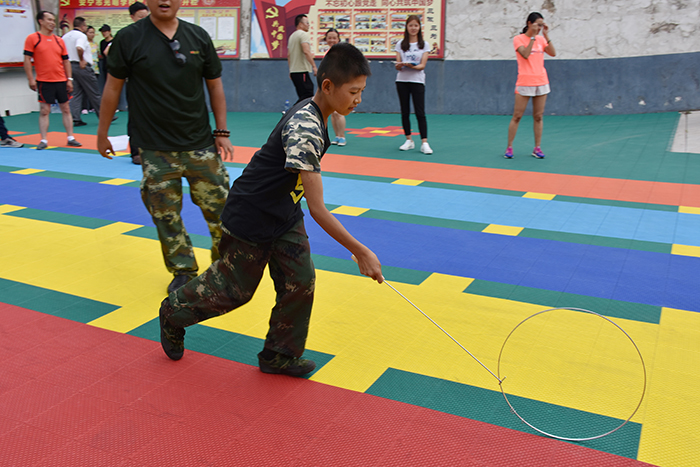 隨后進行的是滾鐵環比賽。同學們從未接觸過這項運動,但在老師簡單的教授之后,便很快學會。在比賽中,大家快速把鐵環推著往前跑,雖然中途有的鐵環偏離路線,有的總是滾不起來,但同學們 “不拋棄、不放棄”的精神感動著場下觀眾,一陣陣加油聲、歡呼聲把比賽一次次推向高潮。最終男生隊獲得了第一名,女生隊獲得了第二名。