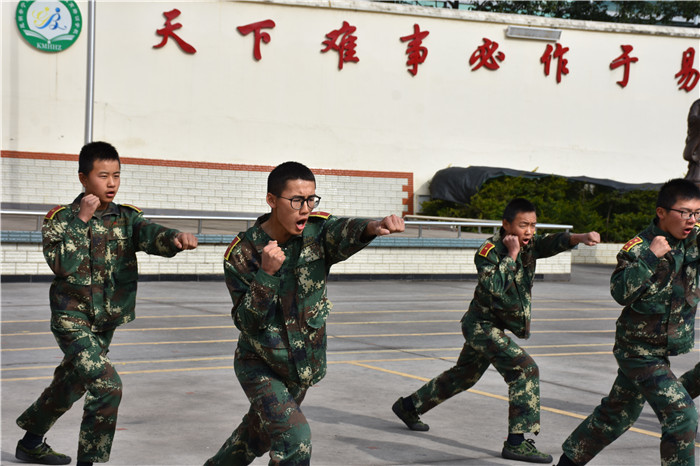 在基本的隊列表演完畢后, 伴著激揚的旋律,女生方隊進行了《大夢想家》手語操和《青春集合在軍旗下》女兵操表演。看!她們一個個精神抖擻,柔中帶剛,舉手投足釋放著青春的活力,贏得了師生陣陣熱烈的掌聲。伴隨著震耳欲聾的吶喊聲,男生方隊出場了!他們個個生龍活虎,一招一式,剛勁有力,為我們淋漓盡致地完整展示了擒敵拳、棍術等,充分展現了當代小軍人的風采。