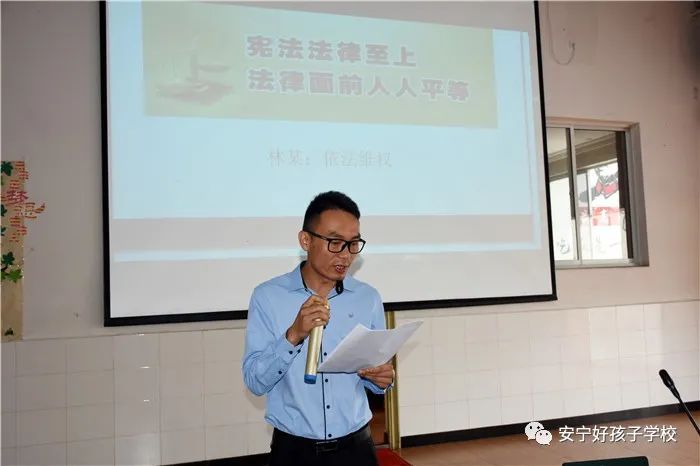 隨后,法制講座在寧湖律師事務所李濤律師的主講中拉開序幕。李律師以青少年在校期間應知應會的基本法律常識為重點,從“你身邊所熟知的法律”講起,結合學生的生理、心理、年齡段特點容易誘發的違法犯罪問題,以真實、鮮活的典型案例進行剖析,舉案說法,警醒同學們應時刻遵守法律,敬畏法律,珍惜自由,珍愛生命,做一個對自己負責、對社會負責的遵紀守法的好公民。