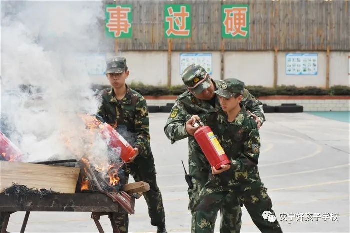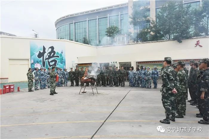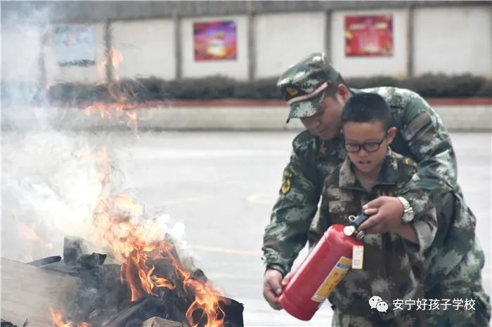 接著開始了消防撲救演練。操場上的木材點燃后,火苗迅速變成了熊熊大火,老師開始現場演示滅火設備(滅火器、高壓水槍、滅火毯、濕毛巾)的使用方法,并指導全部學生親自操作演練。