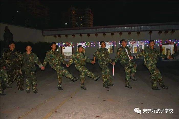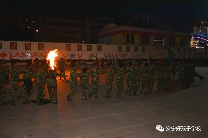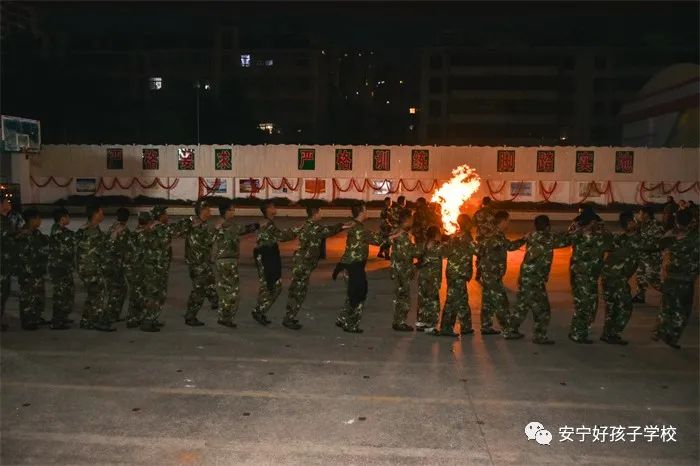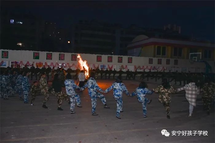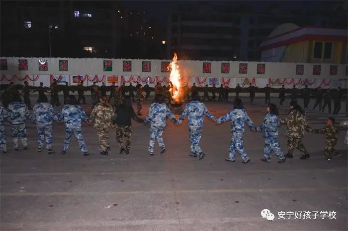 晚餐結束后,大家期待已久的篝火晚會在夜色中正式拉開帷幕。在極具民族特色的“納西三部曲”、“彝族左腳舞”、“兔子舞”等音樂聲中,師生們手拉手、手搭肩,一起圍著熊熊燃燒的篝火歡快地唱著、跳著,載歌載舞。雖然天氣寒冷,但也擋不住同學們高漲的熱情。篝火映紅了夜空,也映紅了孩子們的笑臉。