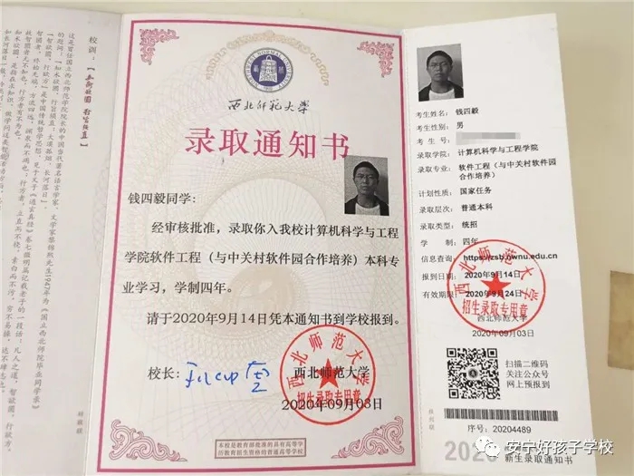 的確,經過好孩子學校10個月的學習,曾經少不更事的錢四毅陽光了、自信了、長大了、懂事了!不但懂得了父母的艱辛與無私的愛,還回歸學校繼續就讀,憑借超乎常人的堅韌和頑強,深夜挑燈,寒窗苦讀,查缺補漏,迅速追趕,最終考上自己理想的大學。