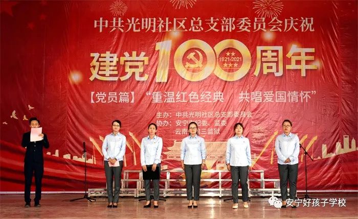 為隆重慶祝中國(guó)共產(chǎn)黨百年華誕, 2021年5月28日下午,我校參加由中共光明社區(qū)支部委員會(huì)主辦,安寧市紀(jì)委、監(jiān)委,云南省第三監(jiān)獄協(xié)辦的慶祝中國(guó)共產(chǎn)黨建黨100周年系列活動(dòng)之“重溫紅色經(jīng)典•共唱愛國(guó)情懷”紅歌比賽活動(dòng)。