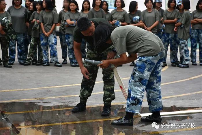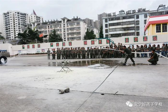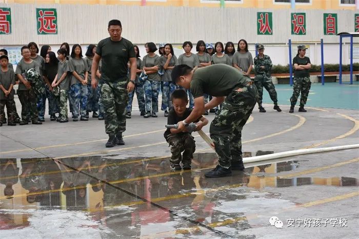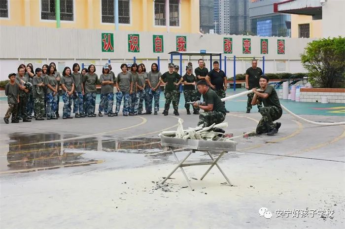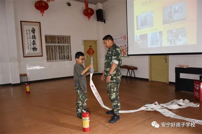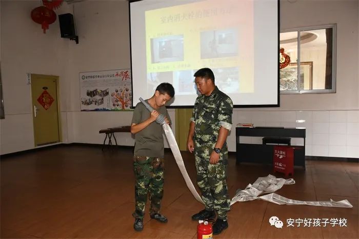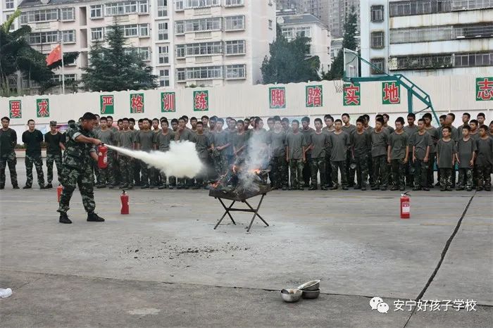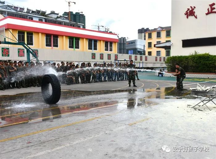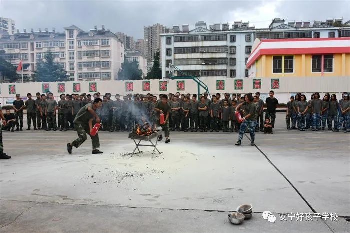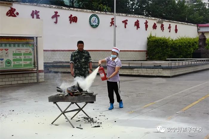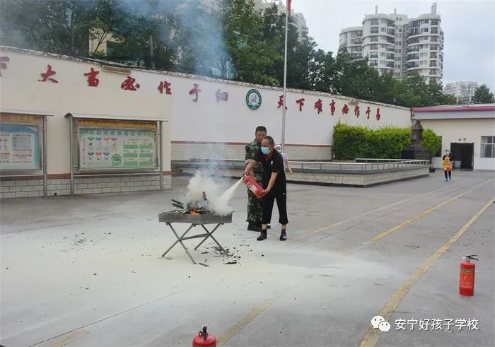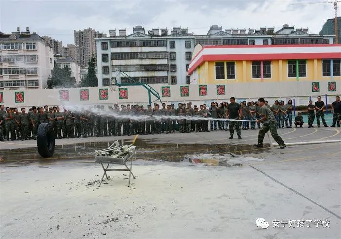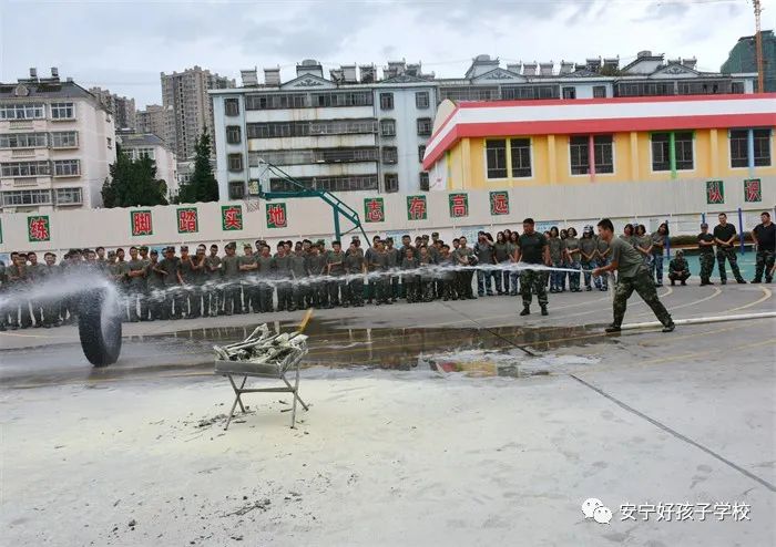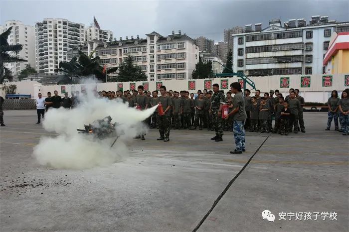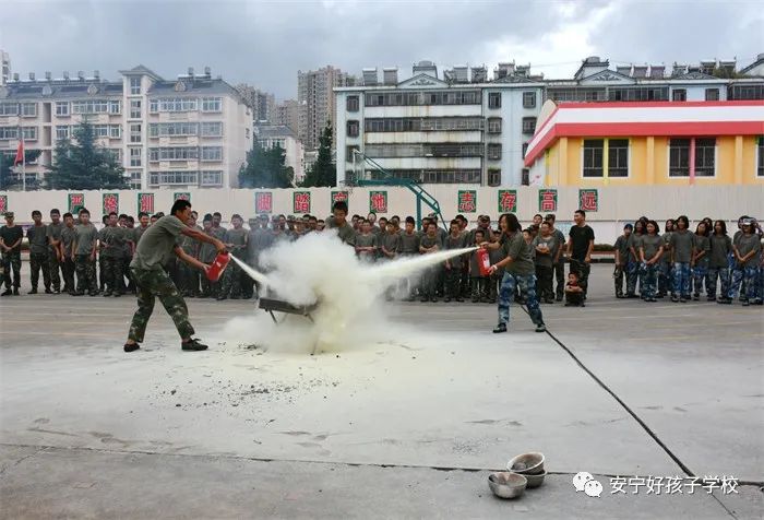 最后,進行了撲救演練。操場上的木材點燃后,火苗迅速變成了熊熊大火,老師開始現場演示滅火設備(滅火器、高壓水槍)的使用方法,并指導全部學生親自操作演練。