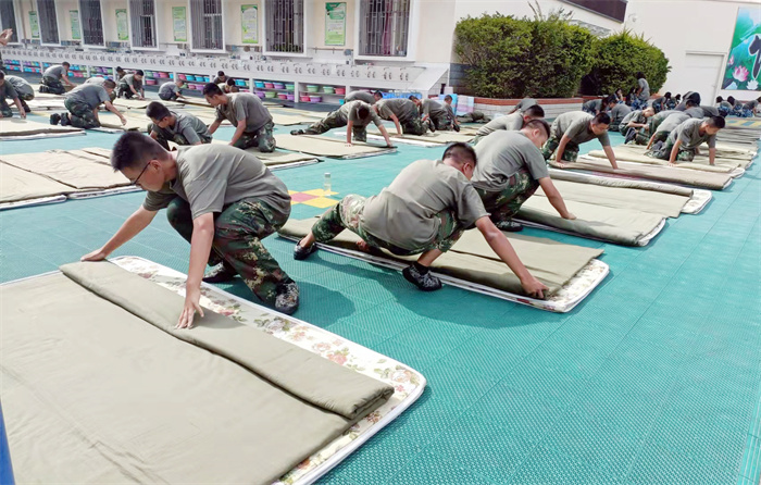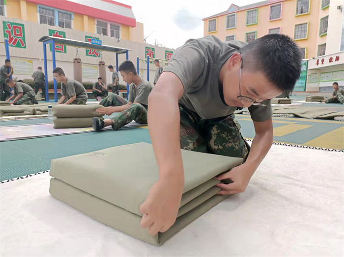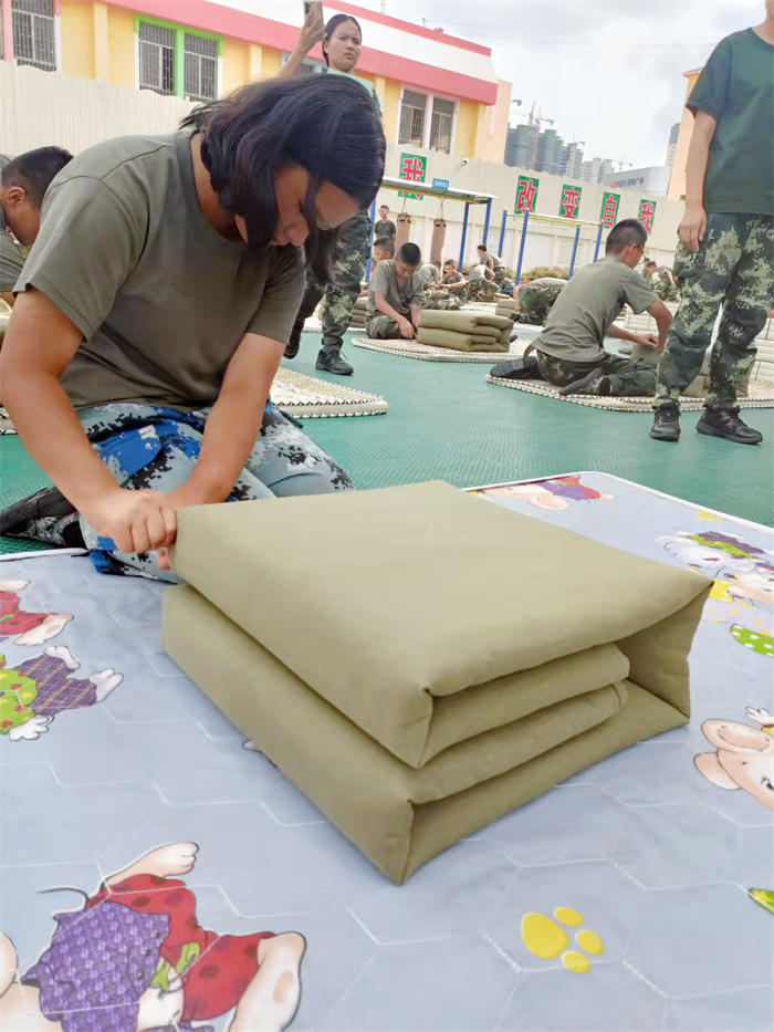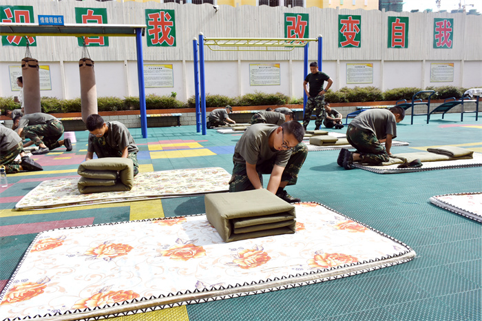 在日常的管理中,老師就對學生的內務整理進行嚴格的要求和具體的指導,如:怎樣鋪平被子,怎樣折疊,左右折疊的長度是多少,疊完后怎樣形成菱角等等。在老師的一聲令下后,比賽開始啦。同學們便本著“既快又好”的原則,使出渾身解數,各展奇招,折、壓、量、磨、捏、修等手法嫻熟,盡全力完成比賽。短短三分鐘,同學們就精雕細琢出一床床棱角分明,方方正正的“豆腐塊”,整整齊齊地放在墊子的一角,等待評比;顒蝇F場,同學們熱情高漲,氣氛異常熱烈。