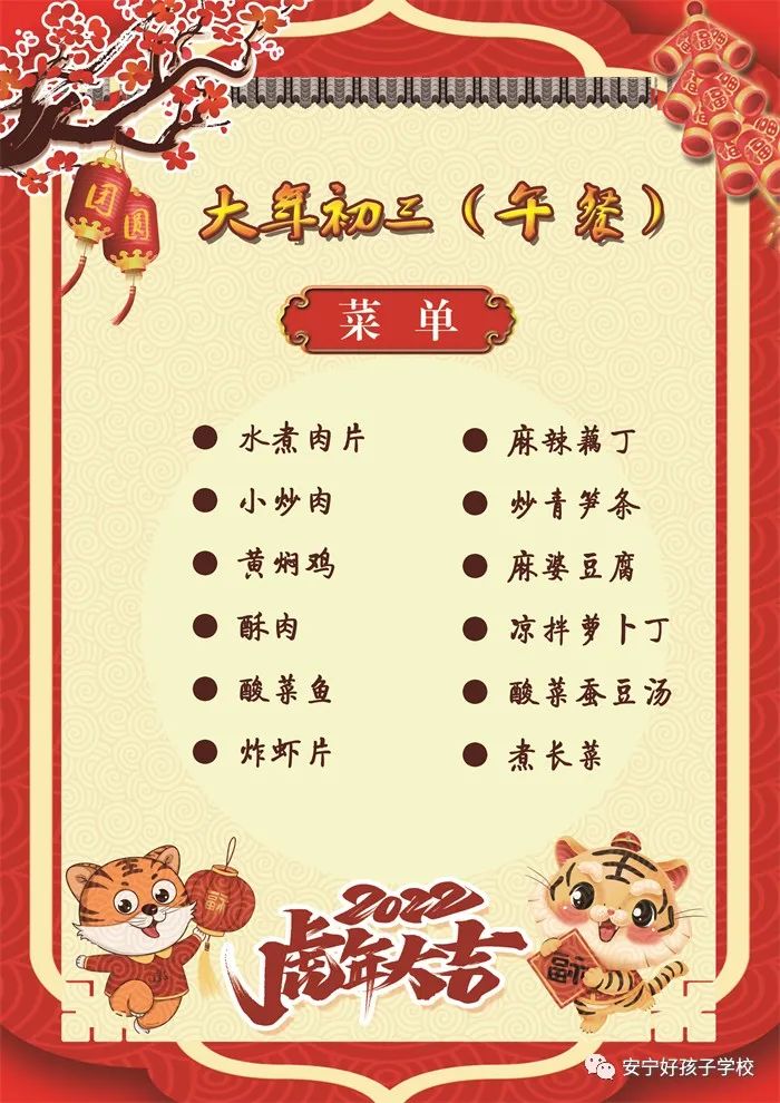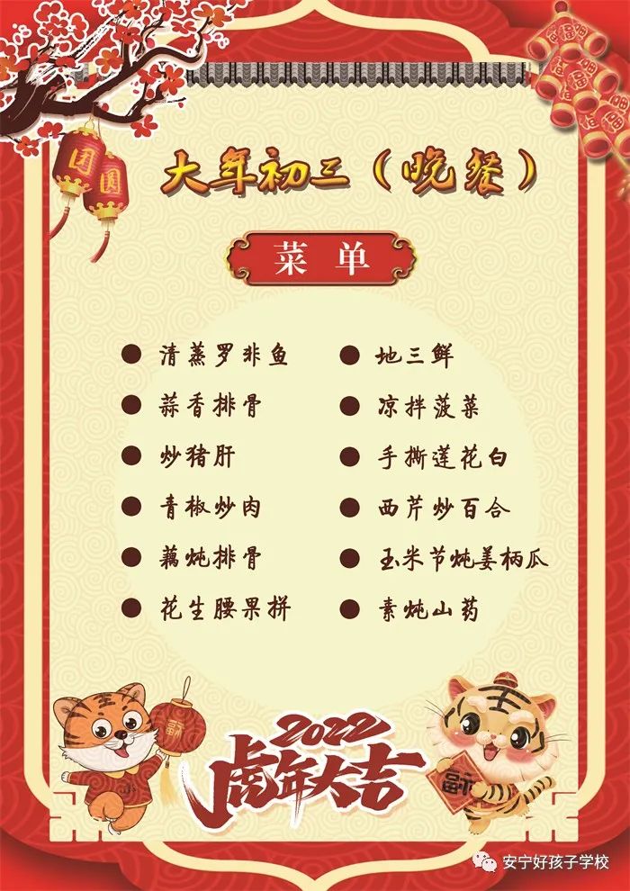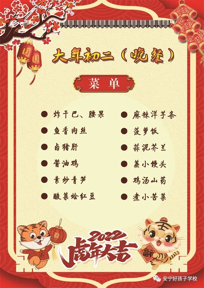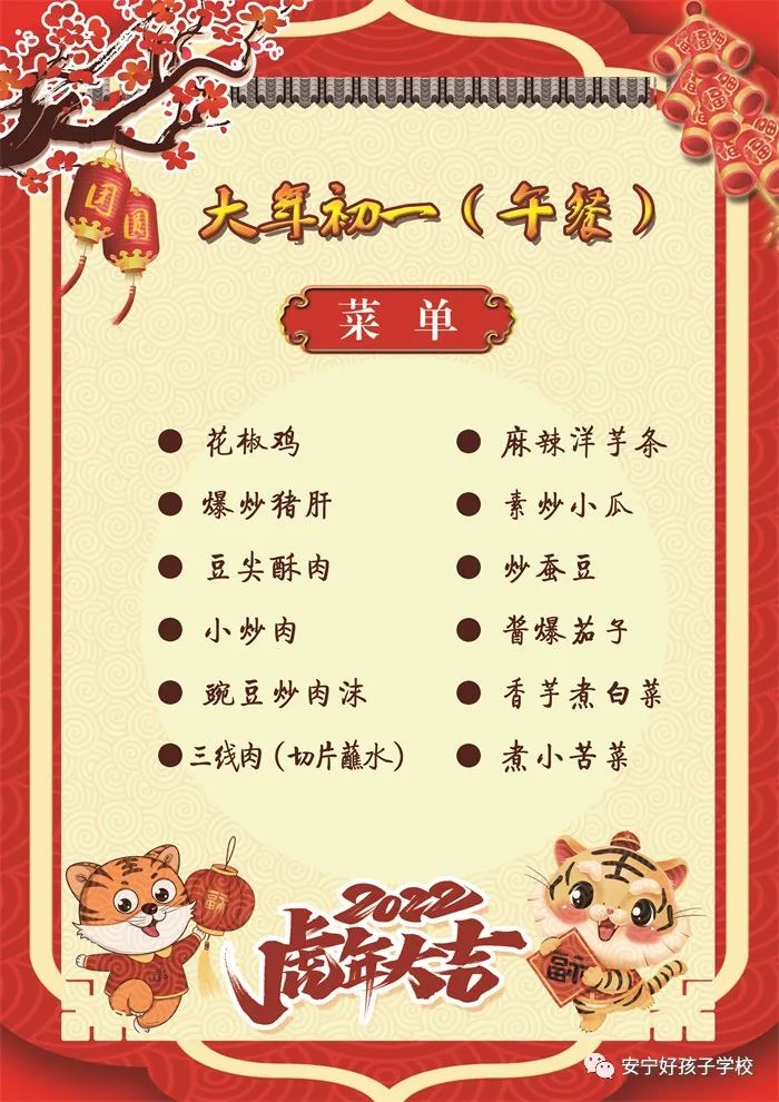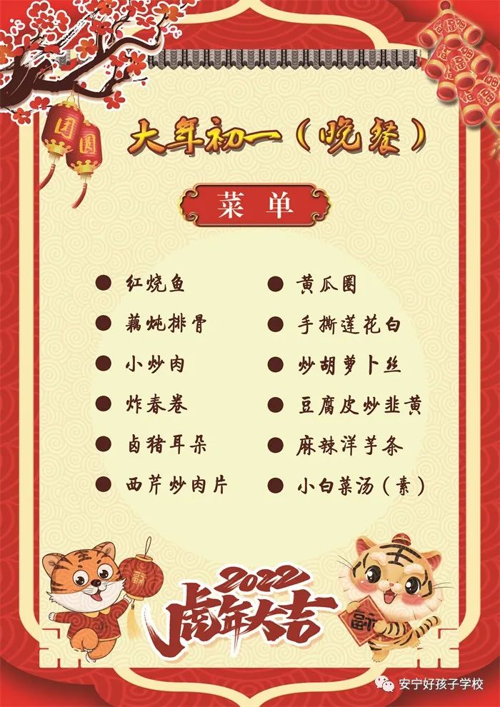 過年了 !孩子們吃什么?這是學(xué)校領(lǐng)導(dǎo)幾天來一直思考的問題。經(jīng)過與學(xué)校營養(yǎng)師、食堂廚師們多次商議后,本著營養(yǎng)、健康、不浪費,又要保證孩子每餐都能吃上新鮮可口的飯菜,終于議定了菜單,現(xiàn)予以公布。祝孩子們新年快樂!祝全體家長萬事如意!