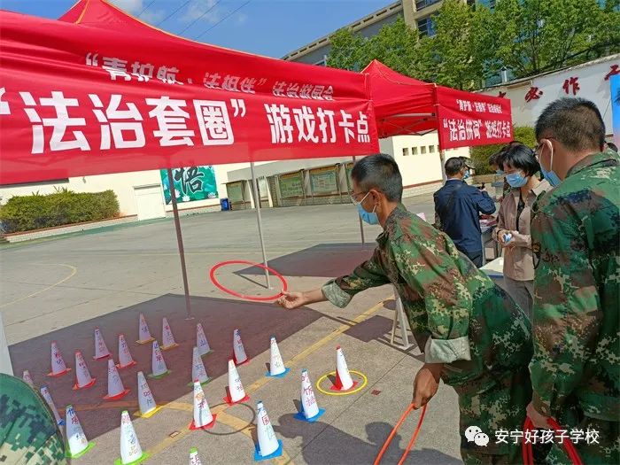 之后開展了以“未保知多少”、“法治套圈”、“法治拼詞”、“法平如水”等多項趣味游園活動。同學們熱情高漲,積極參與其中,每個法治游戲打卡點都熱鬧非凡!胺ㄆ饺缢庇螒蛑,同學們很快掌握了乒乓球運送技巧,快速過關;“法治拼詞”也激起了同學們的挑戰欲,從眾多的字塊中,他們眼疾手快地把一個個法制成語拼湊成功;“未保知多少”也難不倒同學們,大家運用日常法律課堂所學,快速準確作答;是時候表演真正的技術了,“法治套圈”更是激起了大家的勝負欲,當老師發出套 “違法行為”或“不良行為”的口令時,同學們就迫不及待地瞄準、套中,一氣呵成。