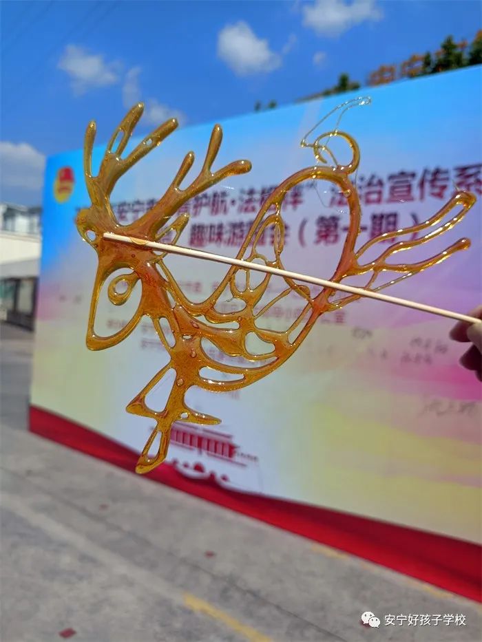 在每個游戲中,同學們都努力集齊“青護航,法相伴”六個字,完成游戲打卡的同學,歡天喜地的到禮品兌換點兌換甜蜜糖畫,一時間,兌換點的糖人泥人供不應求。大家一邊吃著糖人,一邊在簽名墻上留下自己的名字。“糖畫甜在唇間,知識記在心里”!吨腥A人民共和國預防未成年人犯罪法》、《中華人民共和國未成年人保護法》等相關法律法規貫穿游戲始終,同學們在玩中學,在學中樂,無形中強化了同學們的法律意識,增強了法治觀念。