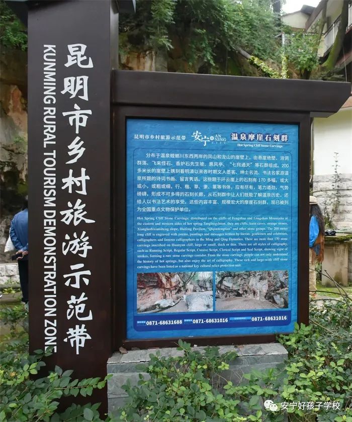 不知不覺間來到了溫泉小鎮摩崖石刻群,上面匯集著從明代至民國年間云南和全國詩書畫名師大家游覽溫泉留下的題詞、詩歌、碑銘、壁畫和書法集錦。古韻十足的摩崖石刻,引得同學們駐足觀看,在驚嘆大自然鬼斧神工的同時,也不忘仔細揣摩石崖上鐫刻著的詩詞書畫,觀之既能讓人了解溫泉歷史,又給人以藝術美的享受。