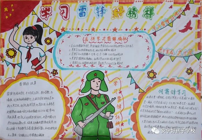 下午,孩子們踴躍參與到“學雷鋒”手抄報活動中。在制作過程中,孩子們通過描繪雷鋒肖像、介紹雷鋒事跡、摘錄《雷鋒日記》等多角度重溫了雷鋒生平,有力地宣揚了雷鋒精神。并結合實際,展現了身邊的“雷鋒”。