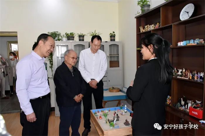 老省長懷著對學校的關心、關切之情,親切地走進學校的辦公區、教學區、生活區等全面查看。在走訪心理輔導室時,老省長駐足良久,饒有興致地和我校心理教研組長趙松瑞(國家二級心理咨詢師)做了深入的交流,趙老師還現場解讀了幾個沙盤的案例。隨后,在多媒體教室觀看了學校教學活動短片,全方位、深層次地了解學校。其間,魯校長就學校的辦學定位、發展理念、辦學特色、安全管理、辦學成績等逐一向老省長作了匯報。