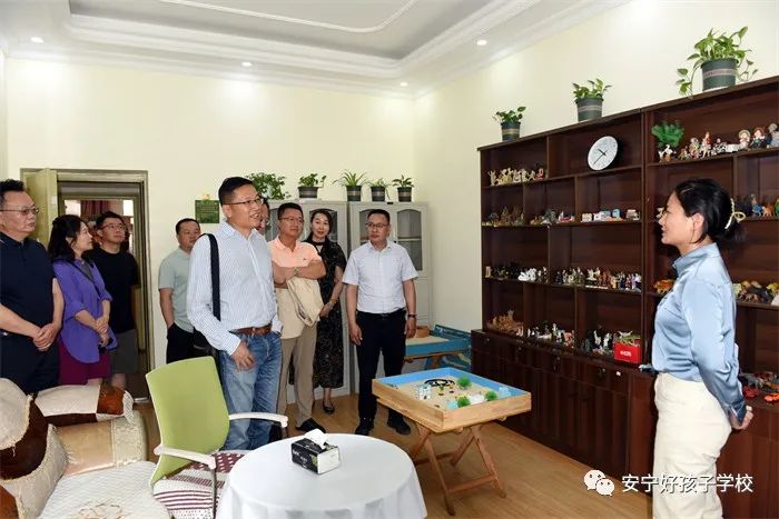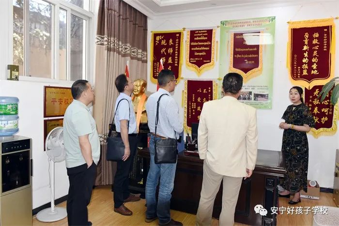 瞿會長一行首先參觀了學校辦公樓、學生餐廳、教學樓、學生宿舍、心理輔導室等硬件設施,隨后與我校心理教研組長趙松瑞老師做了沙盤交流,最后在多媒體教室觀看了教學活動短片。其間,我校副校長李新紅就學校的辦學理念、發展歷程、管理模式、辦學特色、辦學戰略定位、辦學效益等多項內容逐一向領導們做了詳細介紹。執行校長尹斌對領導們提出的問題一一做了解答,并就家庭教育做了深入交流。當看著接待室那面印著老撾文的錦旗,瞿會長非常震驚,他從未想過學校的生源除了省內、國內各地,竟也延伸到了國外,非常驚嘆學校的影響力。