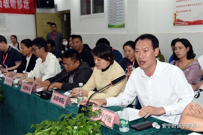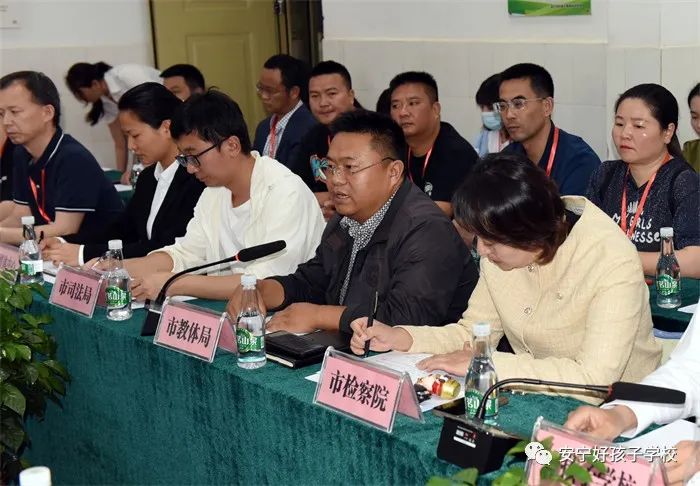 緊接著,召開了座談會。座談會伊始,魯校長介紹了出席領導。隨后,安寧市教育體育局副局長潘健致歡迎辭,并向領導們報告了安寧市的歷史沿革和全市教育事業發展的情況以及取得的各項成績。隨后,安寧市人民檢察院派駐溫泉檢察室主任孫曉宇向領導們作了安寧市預防青少年違法犯罪工作經驗報告。孫主任說道:“安寧既是全國文明城市,也是云南省唯一一家預防未成年人犯罪全覆蓋的地方。安寧市竭力打造社會、社工、社區‘三社’聯動的預防模式,把完善預防體系建設作為提升社會治理現代化的重要途徑。前端,有好孩子學校作為臨界預防和社會觀護的重要陣地;后端,把駐省未管所刑罰執行監督,作為教育改造涉罪未成年人、預防再犯的重要抓手,一體化推進未病先防、既病防變、疾后防復,探索出了具有安寧特色的預防未成年人違法犯罪工作新格局。而且引入國有化社會資源,幫助其就業,預防再犯。尤其是聯合教體、公安著力打造的‘靈雨之光’工作室,有力幫助了公安一站式取證和受害人的心理康復。此外,還聯合公安開展教職工入職查詢,對老師品德進行前期考察,織密校園安全防護網。”