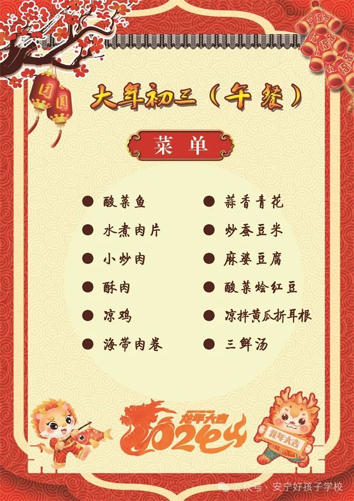 過年了 !孩子們吃什么?這是學校領導幾天來一直思考的問題。經過與學校營養師、食堂廚師們多次商議后,本著營養、健康、不浪費,又要保證孩子每餐都能吃上新鮮可口的飯菜,終于議定了菜單,現予以公布。祝孩子們新年快樂!祝全體家長龍年吉祥、闔家幸福安康!