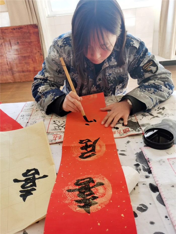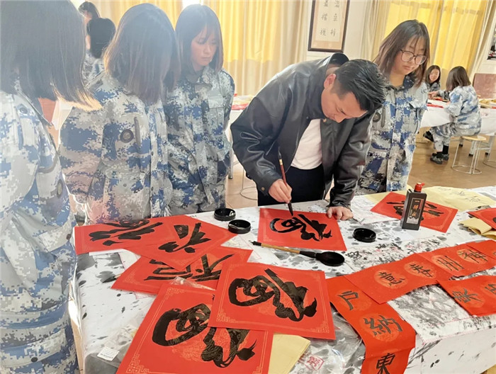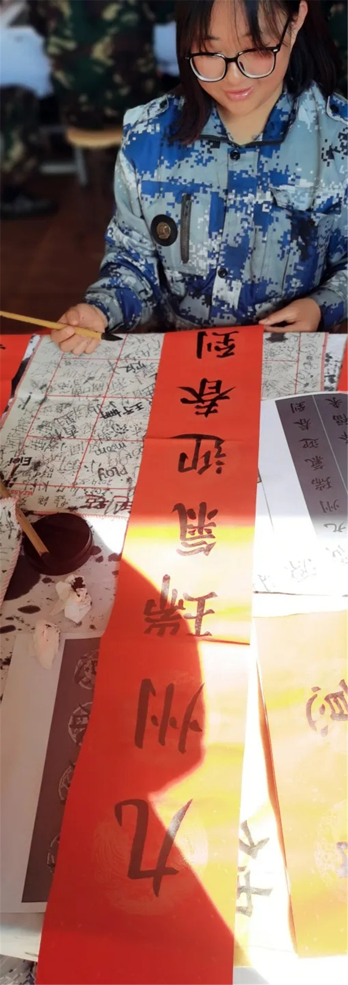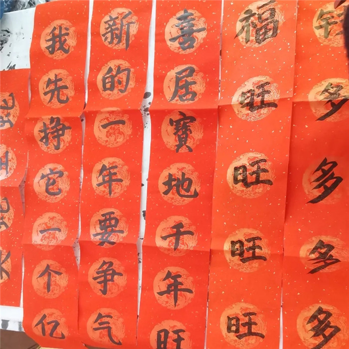 春聯紙上,孩子們筆走龍蛇。有的筆法雖顯稚嫩,卻充滿童趣;有的運筆嫻熟,字體剛勁有力。春聯內容豐富多樣,有贊頌祖國繁榮昌盛的豪邁之語,有抒發家庭幸福美滿的溫馨之言,還有祈求學業進步的懇切之詞。不一會兒,一副副對仗工整、寓意吉祥的精妙詞句便在同學們的筆下應運而生,傳遞出的皆是對新年的美好祝愿。老師寫的福字更是獨具特色,雄渾大氣,無不飽含著對幸福生活的美好向往。現場,紅彤彤的紙張映照著孩子們燦爛的笑顏,新春的喜悅氣息如春風般撲面而來。