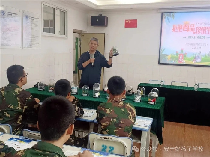 在第38個“國際禁毒日”即將到來之際,為切實增強青少年識毒、防毒、拒毒能力,2025年6月24日上午,云南省第二強制隔離戒毒所教育矯治科警官羅文杰、安寧市禁毒機制辦專職副主任楊志兵、安寧市禁毒機制辦警官周霖、光明社區禁毒專干楊麗華等領導走進我校,為全體師生帶來了一場極具教育意義的禁毒普法宣講活動。